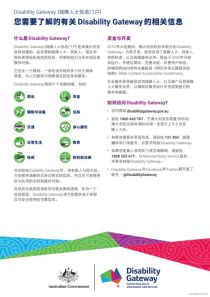 如果您说英语以外的语言,翻译与口译服务,TIS, 可以用您的语言为您读出Disability Gateway上的资料,并提供即时电话口译服务。TIS的电话是131 450。