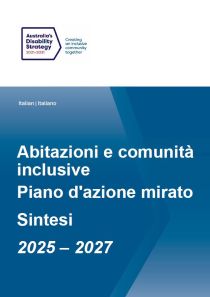 Nell'ambito della strategia australiana sulla disabilità, i piani d'azione mirati (TAP) si concentrano su un periodo da uno a tre anni per ottenere risultati specifici che migliorino gli esiti per le persone con disabilità. Questo documento fornisce una sintesi dell'Inclusive Homes and Communities Targeted Action Plan 2025-2027 (Piano d'azione mirato per abitazioni e comunità inclusive).