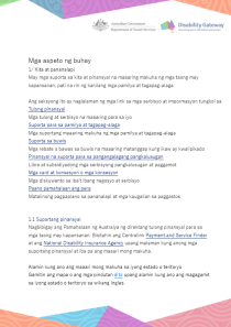 Nagbibigay ang Pamahalaan ng Australya ng direktang tulong pinansyal para sa mga taong may kapansanan. Bisitahin ang Centrelink Payment and Service Finder at ang National Disability Insurance Agency upang malaman kung anong mga suportang pinansyal at iba pa ang maaari mong makuha.