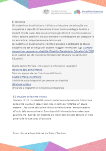 Gli studenti con disabilità hanno il diritto di accedere e partecipare ad attività educative alla pari di tutti gli altri studenti. Maggiori informazioni sugli Standard educativi per persone con disabilità (Disability Standards for Education) del 2005 sono reperibili sul sito internet del Ministero dell'Istruzione (Department of Education).