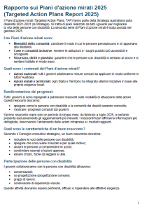 Questi rapporti offrono un riepilogo delle attività nazionali e regionali realizzate in relazione ai Piani d’Azione Mirati (Targeted Action Plans, TAP) nei settori della mentalità della comunità, delle case e comunità inclusive, della sicurezza, dei diritti e della giustizia. I rapporti illustrano gli impegni e i progressi compiuti in ogni Stato e Territorio nel periodo di riferimento che va da gennaio al 30 giugno 2025. Questo rappresenta il primo periodo di rendicontazione della seconda serie dei Piani d’Azione Mirati, avviata a gennaio 2025.