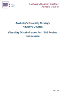 The Australia’s Disability Strategy (the Strategy) Advisory Council (the Council) welcomes the opportunity to provide a submission to the Review of the Disability Discrimination Act 1992 (Cth) (the DDA Review). This submission focusses on the following areas