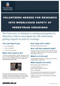 The University of Adelaide is seeking participants for laboratory trials to investigate the risk of wheelchairs getting trapped on railway crossings.