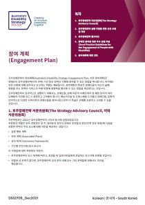 호주장애전략의 참여계획(Australia’s Disability Strategy Engagement Plan, 이하 참여계획)은 장애인이 호주장애전략(이하 전략) 기간 동안 전략의 시행에 참여할 수 있는 방법을 제시합니다. 여기에는 진전 사항에 대해 감독하고 보고하는 역할도 해당됩니다. 참여계획의 특징은 장애인들이 자신의 삶에 영향을 주는 정책과 서비스의 미래 방향에 영향력을 행사할 수 있는 방법을 제공한다는 것입니다.